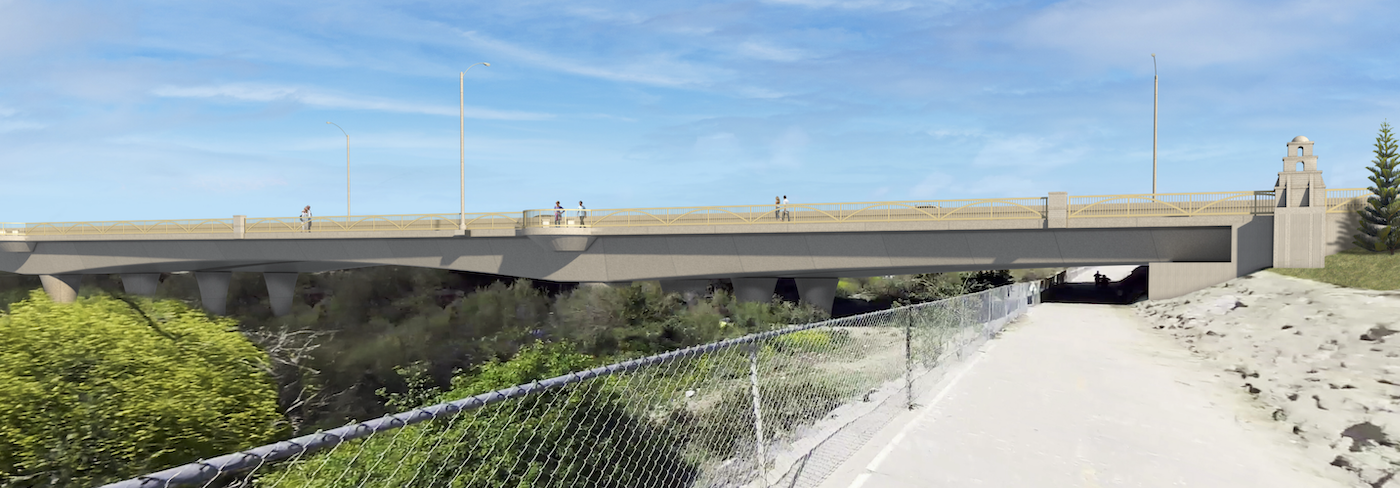 The reconstructed bridge features structural, seismic, and hydraulic state-of-the art design to meet current bridge standards. The new 1,100-foot-long bridge includes two traffic lanes with shoulders in each direction, a concrete center median, and a multi-purpose trail separated from traffic along the south side. [click image to enlarge]